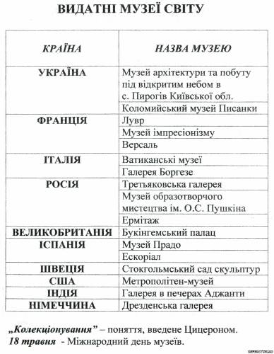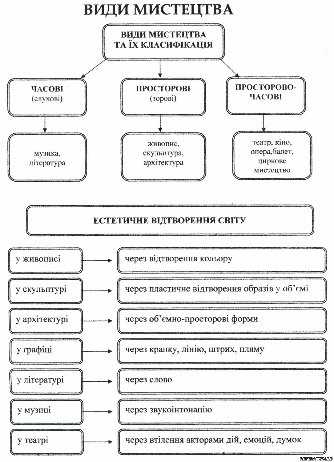 Розділ I. Мистецтво в просторі культури Тема 1. Види і мова мистецтв Урок 1. Види і мова мистецтв Мистецтво - посередник того, чого не можна висловити. Гете Давньогрецький бог Аполлон, заступник мистецтва, з'являвся на Парнасі в оточенні дев'яти дочок Зевса - муз. Богині мешкали на священній горі Гелікон, де било джерело натхнення. Кожна муза мала своє призначення. Евтерпа «завідувала» ліричною поезією, Терпсихора - танцями, Каліопа - епічною поезією, Ерато - любовними піснями, Мельпомена - трагедією, Талія - комедією, Кліо - історією, Полігимнія - священними гімнами, Уранія - астрономією. Вивчення мистецтва, його функціонування та історичний розвиток вимагає попереднього з’ясування того, що є культурою в цілому. Поняття «культура» виникло у Давньому Римі як опозиція поняттю «натура» - природа. Воно позначало «оброблене», «штучне», на противагу «природному», «першоствореному». Відповідно, і сама людина як творець і те, що є створеним, було включене в систему культури. В наш час у багатьох існуючих визначеннях поняття «культури» як виду людської діяльності можна виокремити такі основні модальності цього поняття: - людську (культурний потенціал людини); - процесуально - діяльну (спосіб людської діяльності); - предметну (різноманітність матеріальних, духовних, художніх творінь). Художня культура є підсистемою культури. Місце художньої культури (мистецтва) в цілому можна визначити як спосіб, продукт і принцип організації художньої діяльності в житті людини. Функції художньої культури, як і функції культури в цілому, визначаються тим, що вона живе в просторі і часі. В соціальному просторі вона покликана забезпечити максимальну ефективність процесів творчості, створення художніх цінностей і процесів їх сприйняття публікою у відповідності з її різноманітними духовними потребами. В життєдіяльності людини художня культура має такі функції: • людина як суб’єкт діяльності; • способи діяльності людини; • предмети, створені людиною, - матеріальні, духовні, художні; • способи діяльності людини щодо «розкодування» тих якостей, що закодовані в творах мистецтва; • людина як витвір культури; • спілкування як певна форма людської діяльності, що забезпечує практичне і духовне єднання людей заради здійснення загальних цілей. Мистецтво існувало з найдавніших часів. Адже потреба створювати прекрасне, захоплюватися красою і гармонією навколишнього світу закладена у людині самою Природою. Саме тому мистецтво не старіє. Створені сотні і тисячі років тому твори - картини, скульптури, будинки хвилюють нас і сьогодення своєю красою і досконалістю. Мистецтво — це специфічна форма пізнання реальної дійсності, форма відображення життя в конкретних, індивідуальних, неповторних художніх образах, в яких виражені думки і почуття, соціальні ідеї — політичні, моральні, естетичні і т.д. Мистецтво існує й історично розвивається як система взаємозалежних між собою видів, різноманіття яких обумовлене різноманіттям і багатогранністю реального світу. Історично склалися стійкі форми існування й розвитку мистецтва — архітектура, декоративно-прикладне мистецтво, живопис, скульптура, графіка, художня фотографія, література, музика, хореографія, театр, кіно, телебачення, мистецтво естради, цирк, які й одержали назву видів мистецтва. На ранніх етапах розвитку людст
